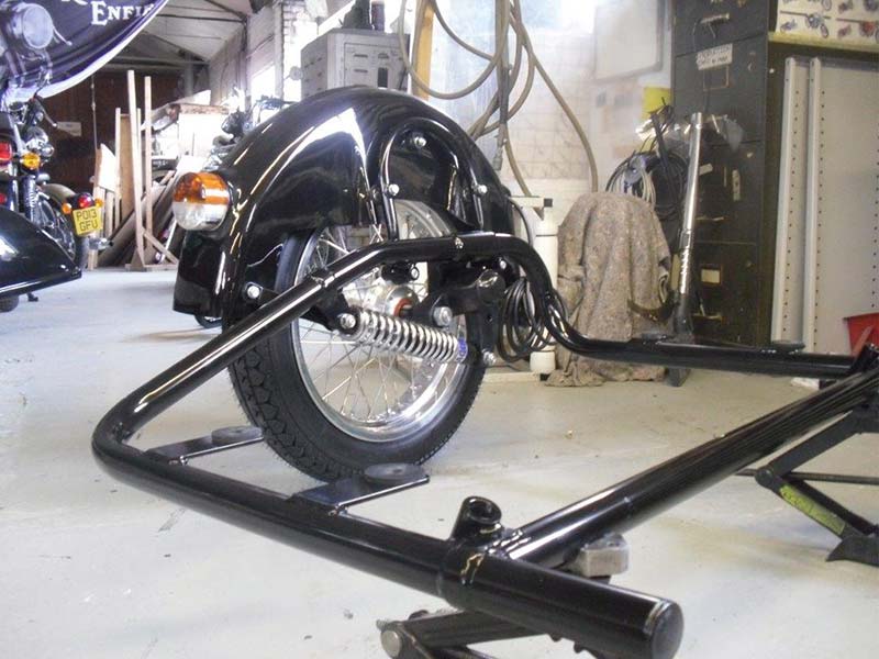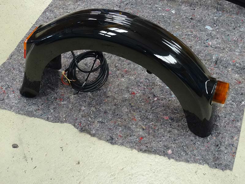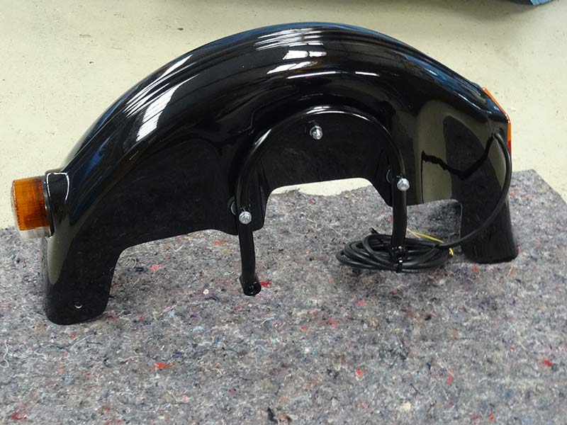 1 Sitzer, GFK schwarz eingefärbt, aufpoliert, mit Brookland Scheibe, Sitz, Regenpersenning, Teppichausstattung innen, Beleuchtung, Kotflügel, starres Sauer/Mueller-Fahrwerk als Variante A "starr": Sauer-Schräglenker Langschwinge, Bilstein Gasdruckdämpfer, hydraulischer Bremse, Drahtspeichenrad 15 Zoll und Reifen in 135/80(70) x 15