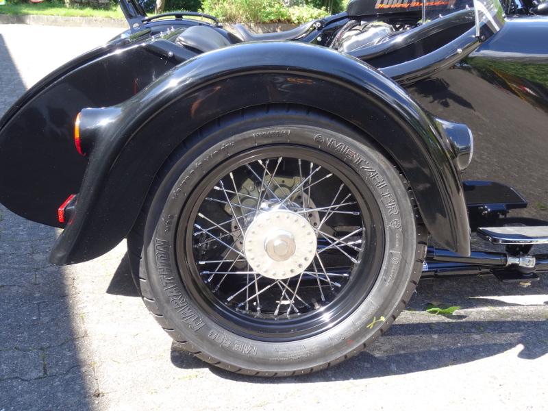 Am Motorrad wurde eine gereckte Gabelbrücke der Fa. Mueller-Motorcycles verbaut, um die Lenkkräfte im Gespannbetrieb zu minimieren.