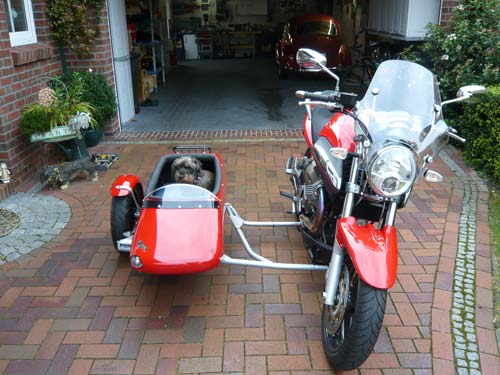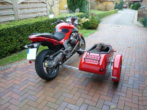 Dieser Seitenwagen ist nur für Gepäck und kleine Hunde ausgelegt.